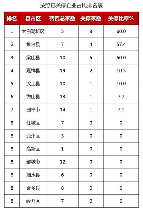 目前,濟寧市磚瓦企業整合重組工作穩步推進,122家磚瓦企業中,17家企業已關停,包括曲阜1家,魚臺4家,梁山5家,汶上1家,太白湖3家,嘉祥2家,微山1家;105家企業處于前期,其中任城7家,兗州3家,高新1家,曲阜13家,鄒城12家,泗水6家,微山12家,魚臺3家,金鄉8家,嘉祥17家,汶上9家,梁山5家,太白湖2家,經開區7家;按照已關停企業占比進行排名,排在前三名的縣市區為太白湖新區、魚臺縣、梁山縣,關停占比分別為60.0%、57.4%、50.0%。