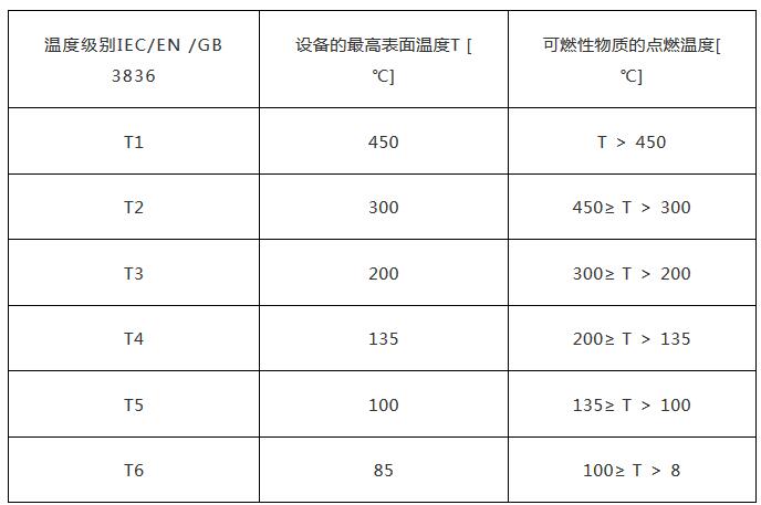 電氣設備按其最高表面溫度分為 T1 ~ T6 組,使得對應的 T1 ~ T6 組的電氣設備的最高表面溫度不能超過對應的溫度組別的允許值。溫度組別、設備表面溫度和可燃性氣體或蒸汽的引燃溫度之間的關系如下表所示:
