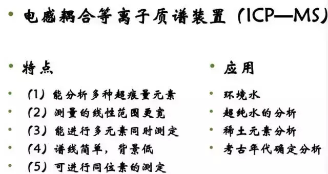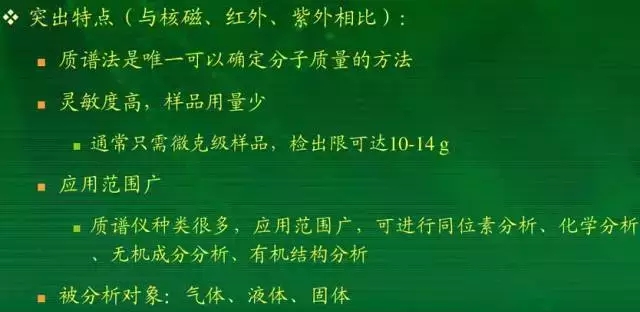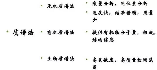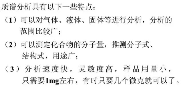 質(zhì)譜: 分析分子、原子、或原子團(tuán)的質(zhì)量的,可以推測物質(zhì)的組成,一般用于定性分析較多,也可定量。