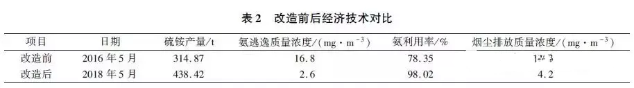 按硫銨600元/t 、純氨2200元/t、年運行小時為7000h估算,硫銨產量增加所增加的收益約為69.75萬元/a。氨逃逸減少所節約的費用約為12.02萬元/a,合計為81.77萬元/a。