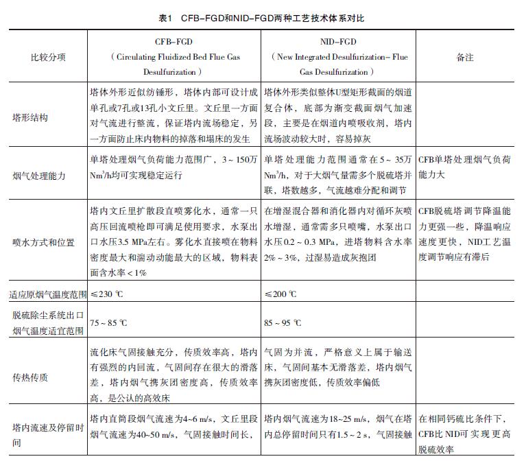 煙氣循環流化床CFB-FGD、 NID-FGD兩種半干法脫硫除塵治理工藝技術體系對比見表1。