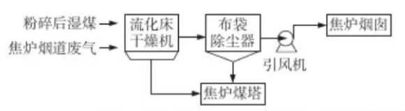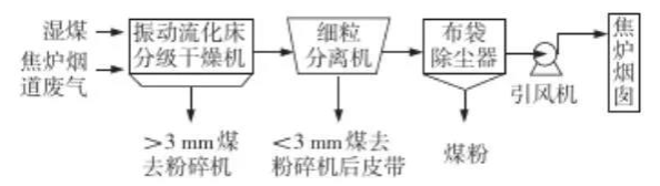 煤調濕是將煉焦煤在裝爐前除去一部分水分,保持裝爐煤水分穩定在6%左右,然后裝爐煉焦。日本、俄羅斯等國家普遍使用,在我國煤調濕已成為焦化行業重點開發并積極推廣的技術。利用焦爐煙道廢氣煤調濕工藝不但可以節省能源,減少廢氣、廢水、廢熱的排放,而且可以提高裝爐煤堆密度及煉焦初期升溫速度、縮短結焦時間,從而實現節能降耗的目的。