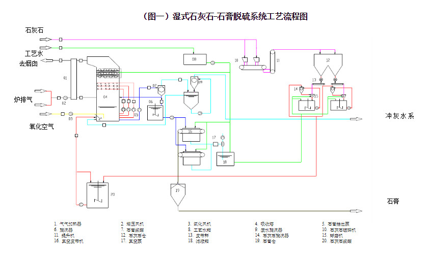石灰石(石灰)/石膏濕法脫硫工藝系統(tǒng)主要有:煙氣系統(tǒng)、吸收氧化系統(tǒng)、漿液制備系統(tǒng)、石膏脫水系統(tǒng)、排放系統(tǒng)組成。